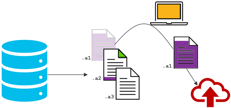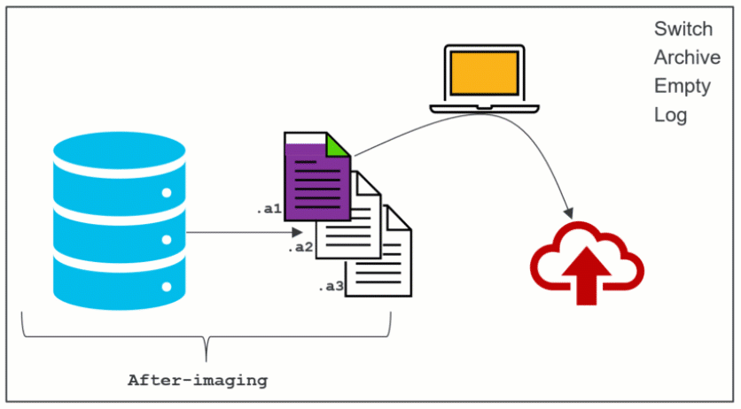 Objective: This image shows that a database writes to a sequence of after-imaging (.a#) files. When one of the files becomes full (.a1 in the PNG), the active tag moves to the next file in the sequence (.a2 in the PNG) and the full file is deactivated. The computer indicates that a user then prompts the archiving (through varied methods), and finally, the file moves to the backup location.